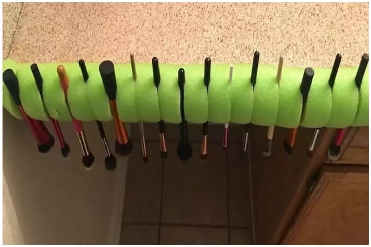 Just like how you can use pool noodles as fixtures for brooms and other accessories, they can also come in handy for creating a horizontal holder for your makeup brushes. If you’re someone who enjoys applying makeup on a daily basis, you’re probably familiar with the struggle of locating the right brush from your makeup bag. To alleviate this issue, simply grab a pool noodle and secure it near your mirror using glue or tape. Then, make several small incisions in the pool noodle, transforming it into a practical fixture for organizing your makeup brushes.