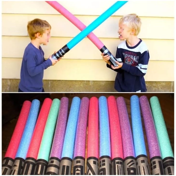 Star Wars has shaped the interests of a whole generation of film enthusiasts. Given the continuous release of new movies and spin-offs, it is not surprising that children have a strong affinity for Star Wars-related toys and accessories. One creative option is to utilize pool noodles, which come in a variety of colors, to construct lightsabers. All you need to do is cut long segments from two different colored pool noodles and affix a homemade handle or grip. This approach is not only affordable but also safe for kids, making it a preferable alternative to pricier and heavier lightsabers available on the market. Your children are sure to adore it.