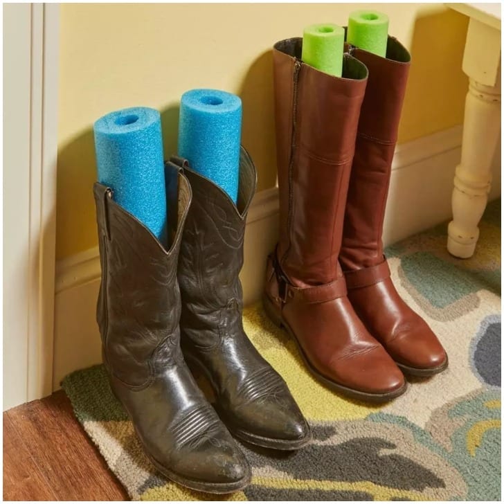 Taking care of your knee-high shoes can be quite challenging, as they tend to slump when not worn, potentially causing damage to the leather or other materials. However, you can easily maintain their shape by using poodle noodles. Simply insert these noodles inside the shoes whenever you’re not wearing them, and they will remain upright without causing any harm to the material.