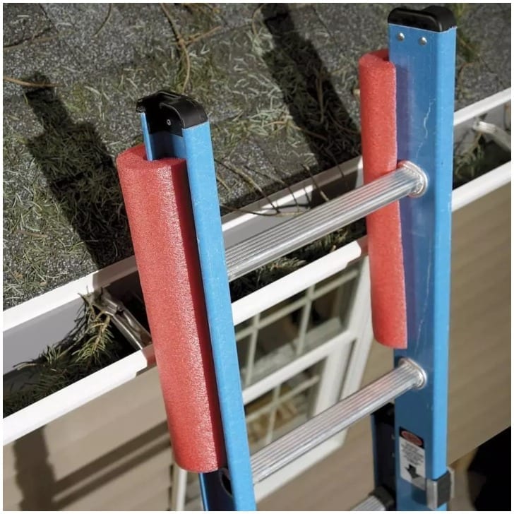 Investing in a sturdy ladder is a wise choice when it comes to accessing the roof. However, if your gutters are high and narrow, reaching them safely could be challenging for the average person. Fortunately, there is a clever solution to this problem. By using a pool noodle, you can easily create two cushioning pieces. Simply cut the pool noodle in half and attach each piece to the sides of the ladder where it makes contact with the gutter. This additional padding will provide you with an added sense of security, alleviating any fears of falling.