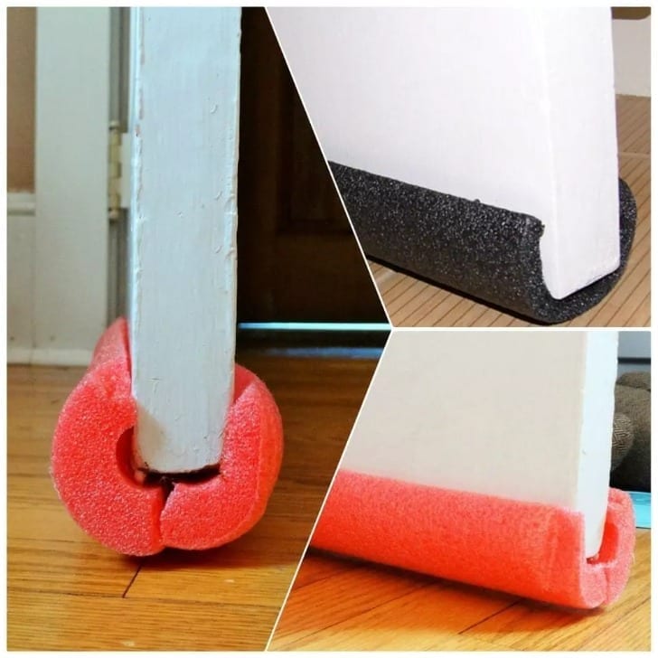 If you want a cost-effective solution to block drafts from entering through doors, here’s what you can do: Get pool noodles that are 50 inches long and cut them into three pieces, each measuring 12 inches. Position two of these pieces on either side of the door. Take another piece, this time measuring 24 inches in length, and fold it in half. Attach a clothespin to each end to create loops, and insert these loops into the existing two pieces.