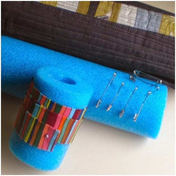 If you’re looking to organize your supplies that often get misplaced or lost in the shuffle; Get some pool noodles from your local store. Cut them and use them as pincushions. It can be really handy when storing open basting pins. When you are not sewing just put the pins back on the pool noodles. You can also use different colored pool noodles to segregate different types of pins and needles.