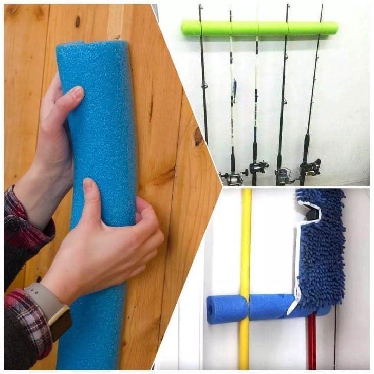 Pool Noodles can be hung on wall horizontally and cut in places to make a holder. You can hold different items like brooms, fishing rods and other accessories. Make sure these accessories are light weight as the pool noodles wouldn’t be able to take the weight of heavier objects. Also know the length of the accessory before putting them on the fixture. Try not to hang accessories on your pool noodle fixtures as you can just use them to hold these accessories in place while the bottom of the accessory touches the floor.
