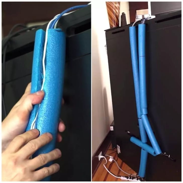 Disorderly wiring poses a risk, as it can result in short circuits and even start a significant fire in your home. Typically, this type of wiring is commonly found in areas where various appliances are located close together. To address this issue, pool noodles can be utilized to effectively organize these disorderly wires. Simply cutting one side of a pool noodle and wrapping it around the wires can enhance safety in your house and create a more organized and visually appealing room for visitors.