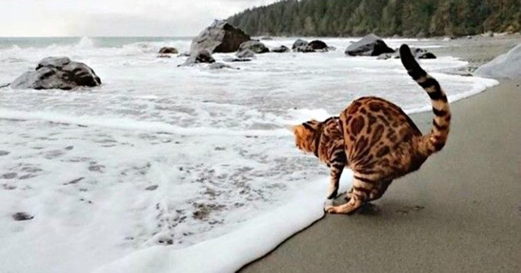 Who could have possibly thought it would be a wise decision to bring a cat to the beach initially? The enjoyment and exhilaration might commence upon taking the first step into the water. This photograph appears to depict a real-life situation. The impeccable timing of the shot is truly remarkable. The photographer has skillfully captured an incredibly remarkable pose.
